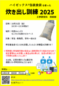 技術部では地震などライフラインが麻痺するような大規模災害に備えて飲食物の備蓄ならびに春・秋の大学行事に合わせてそれらを使用した炊き出し訓練を実施しています。今回は学生教職員の皆様、並びに学外一般の方々に非常時での対応の一計として実際に炊き出し体験をしていただき、 必要材料・物資等を考えて学外、自宅等での場所、人数に応じた対策を検討していただくことを考えています。