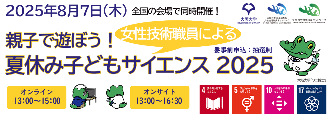 令和7年8月7日、大阪大学部局横断型女性技術職員ネットワーク主催の「親子で遊ぼう! 女技の夏休みサイエンス2025」が開催され、技術部からも3名の女性技術職員が講師として参加しました。